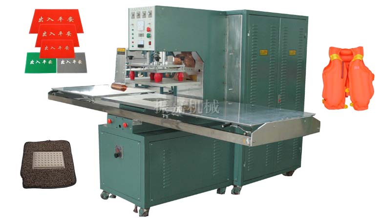 大型高周波机:此机适用于摩托车坐垫、大面积胶袋、大面积皮革压印、门垫脚垫压合烫金、轮椅座椅垫等。滑 台式高周波机请看下图: